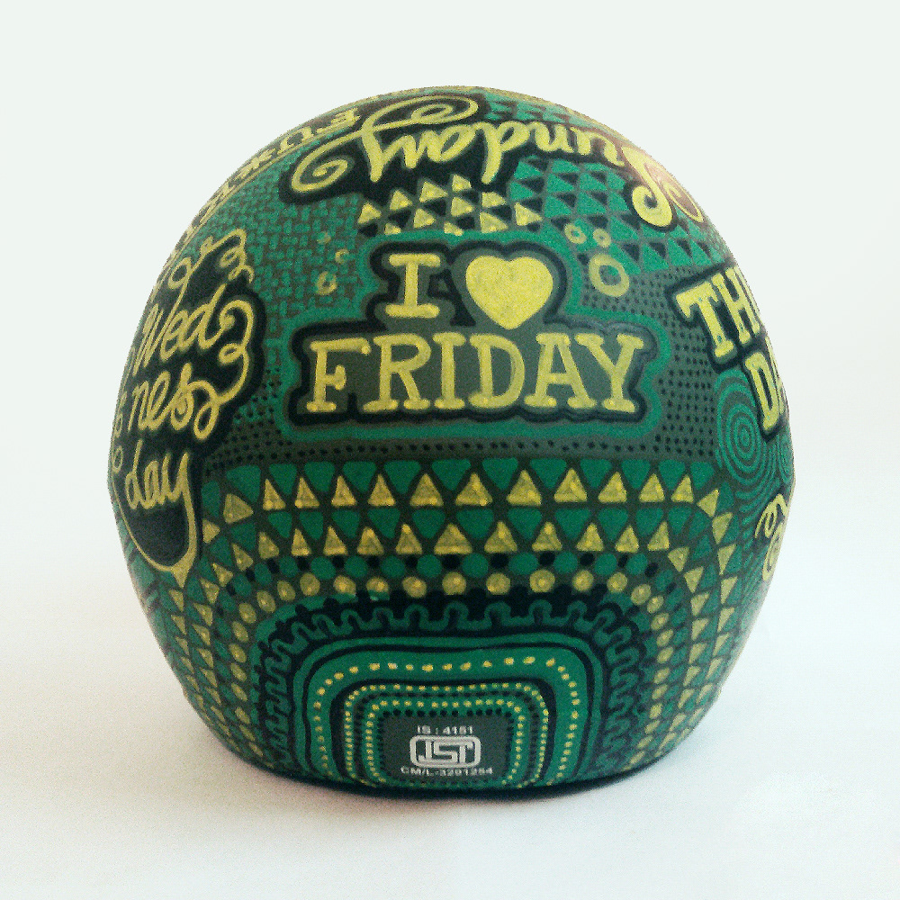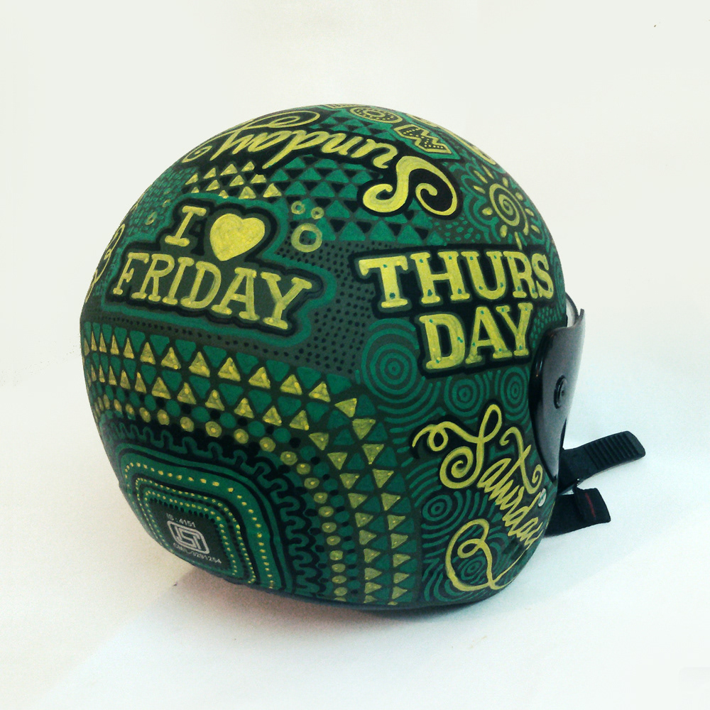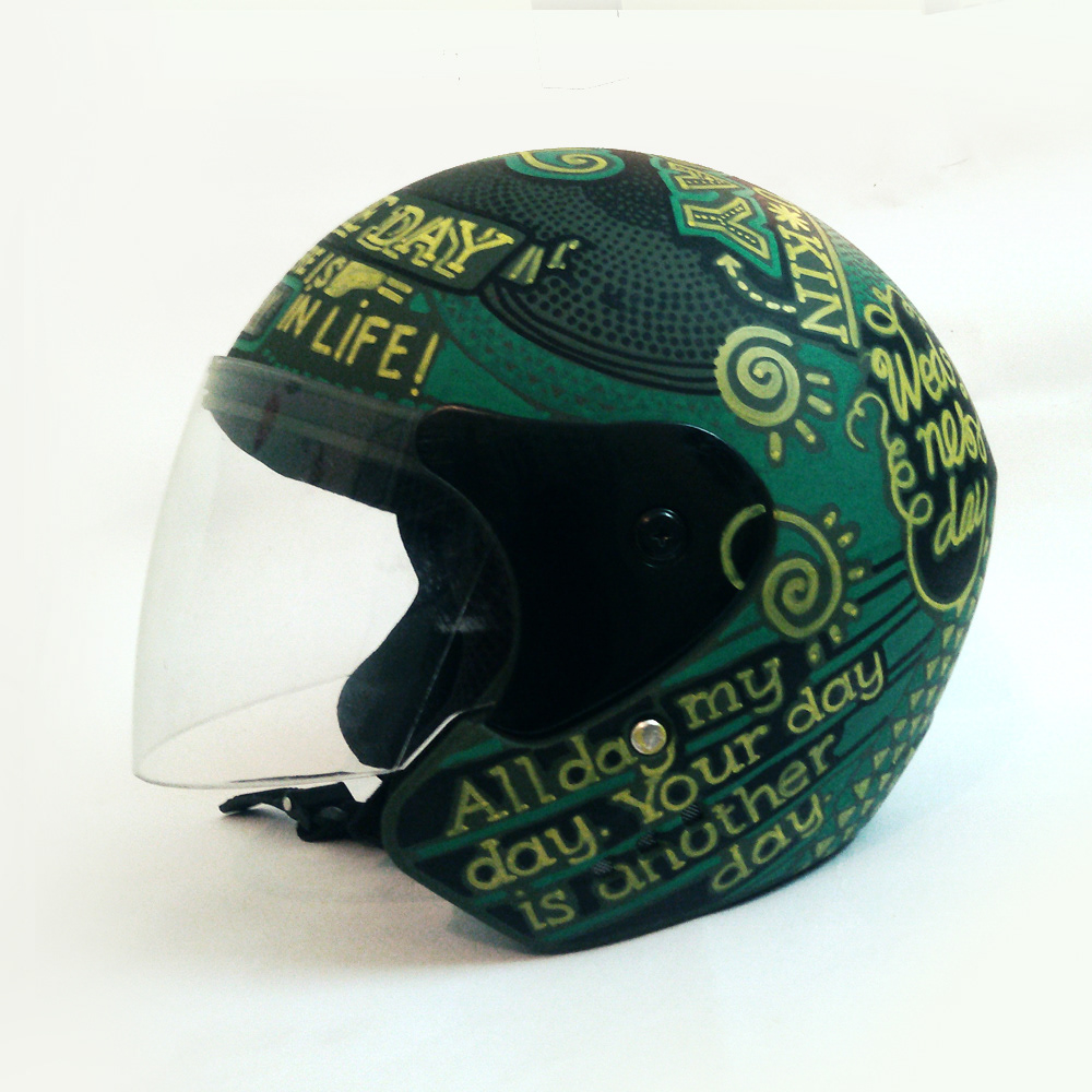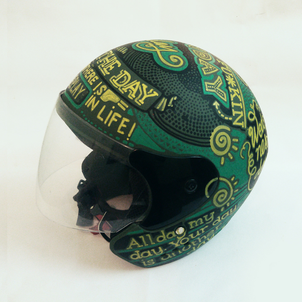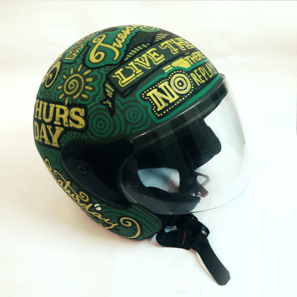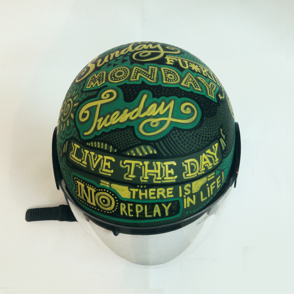 Hand drawn typography on a helmet.